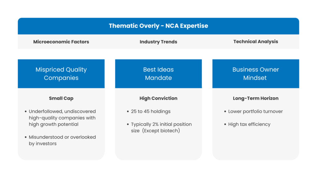 “Our investment philosophy combines bottom-up stock selection with a top-down thematic overlay. We incorporate macroeconomic insights, industry, and technical analysis to identify mispriced quality companies. With a concentrated portfolio and a long-term business owner mindset, we aim for consistent outperformance and value creation.“