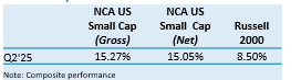 Q2 proved to be a volatile yet ultimately rewarding period for the small-cap Russell 2000 Index with the winners concentrated in cyclical and growth-oriented areas of the market. IT, Industrials, and Materials were the best performing sectors, returning 21.3%, 15.6% and 13.0%, respectively. The reshoring of manufacturing and increased capital investment provided a tailwind for many industrial companies, while the return of the AI trade gave a boost to the IT sector. The worst performing sector was Real Estate, returning -1.82%, followed by Utilities and Energy, returning -1.28% and -1.07%, respectively. These more defensive and rate-sensitive sectors struggled and Energy stocks were weighed down by volatile commodity prices.